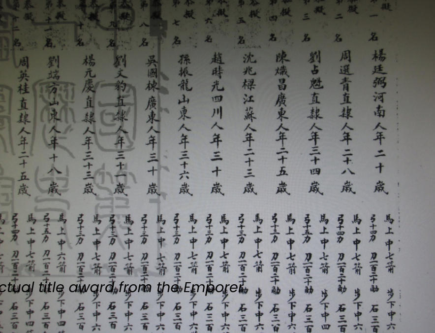 Yang practiced diligently day and night. He entered the imperial military examinations (武举), and excelled in the provincial, capital, and palace levels. In 1883, he earned the title of Martial Optimus (wuzhuàngyuán武狀元) of the Empire, based on the Palace Exam hosted by Emperor Guangxu. To achieve this extraordinary designation meant displaying mastery of a wide range of subject matters, from martial arts to archery, and from horsemanship to erudition in the so-called Seven Military Classics (including The Art of War).
